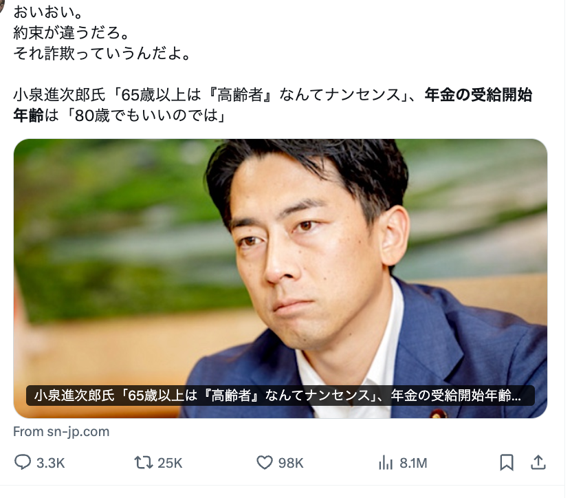 「いいわけねーだろ 親父は73で死んだわ」「国民の半数は一生年金を払って1円も認められないまま死んでいくんですね」と言った批判も広がっており、その多くは小泉氏が年金受給開始年齢を80歳まで遅らせるような発言をしたと受け止めている。