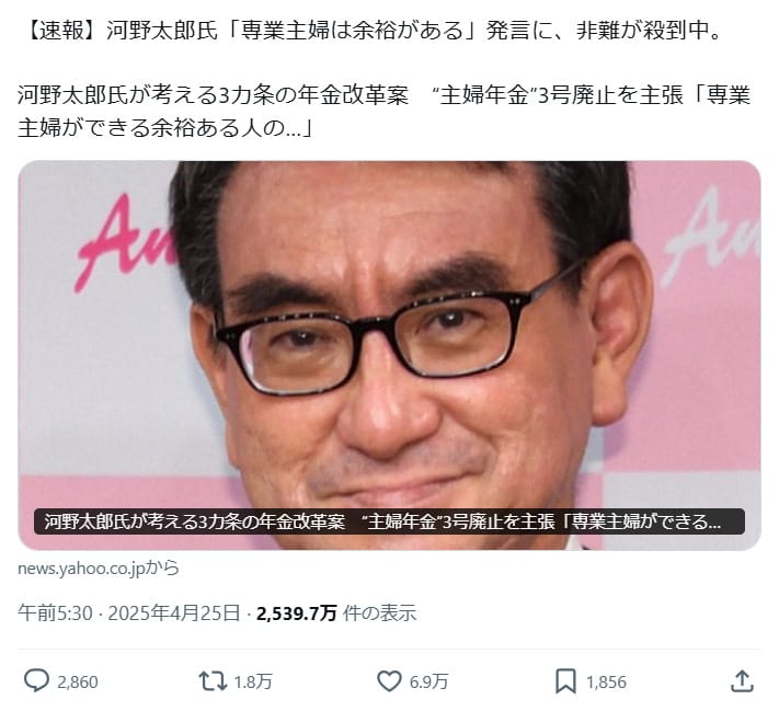 2025年4月25日、河野氏が「専業主婦は余裕がある」と発言したという投稿がXで拡散した。