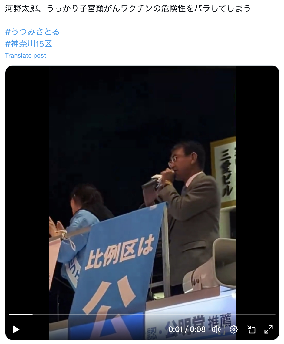 2024年10月21日、X(旧Twitter)で、「河野太郎、子宮頸がんワクチンの危険をうっかりバラした」という投稿が、河野氏の演説の動画と共に拡散した。10月25日現在、閲覧数は97万を超え、5600以上のリポストがある。