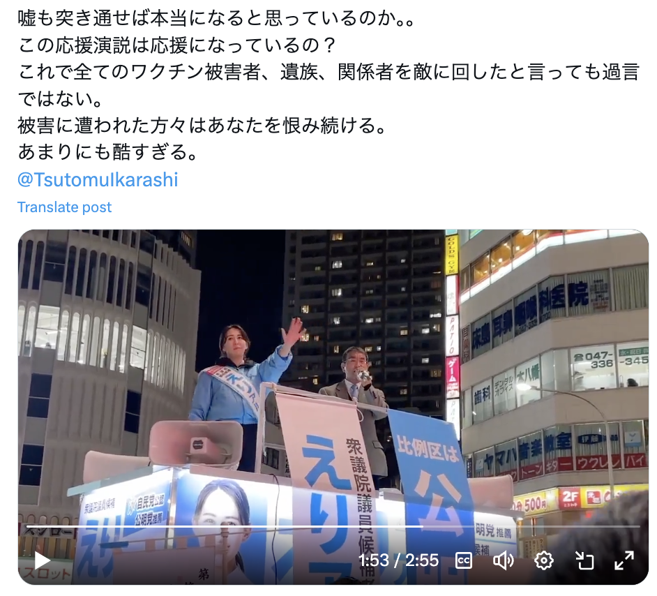 2分55秒間の動画では、河野氏の横に千葉5区に自民党から立候補している英利アルフィヤ氏がおり、応援演説の場面であることがわかる。「デマにデマ重ねんじゃねえよ」「人間として恥ずかしくねえのか」「子宮頸がんワクチンは毒を持っていますよ」といったヤジも飛んでいる。