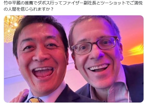 8月10日、「竹中平蔵の推薦でダボス行ってファイザー副社長とツーショットでご満悦の人間を信じられますか?」という文言付きの、玉木氏と男性のツーショット画像がXで拡散した。