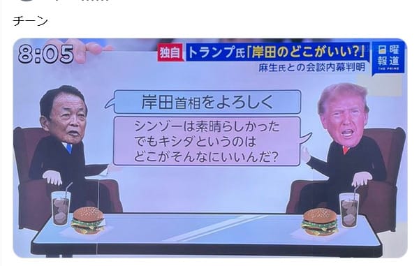 2024年4月28日、米国のトランプ前大統領が、麻生副総裁との会談で「岸田のどこがいい?」と発言したとする言説がX(旧Twitter)で拡散した。投稿には、テレビ画面のような画像が添付され、右上に「日曜報道」とロゴがある。