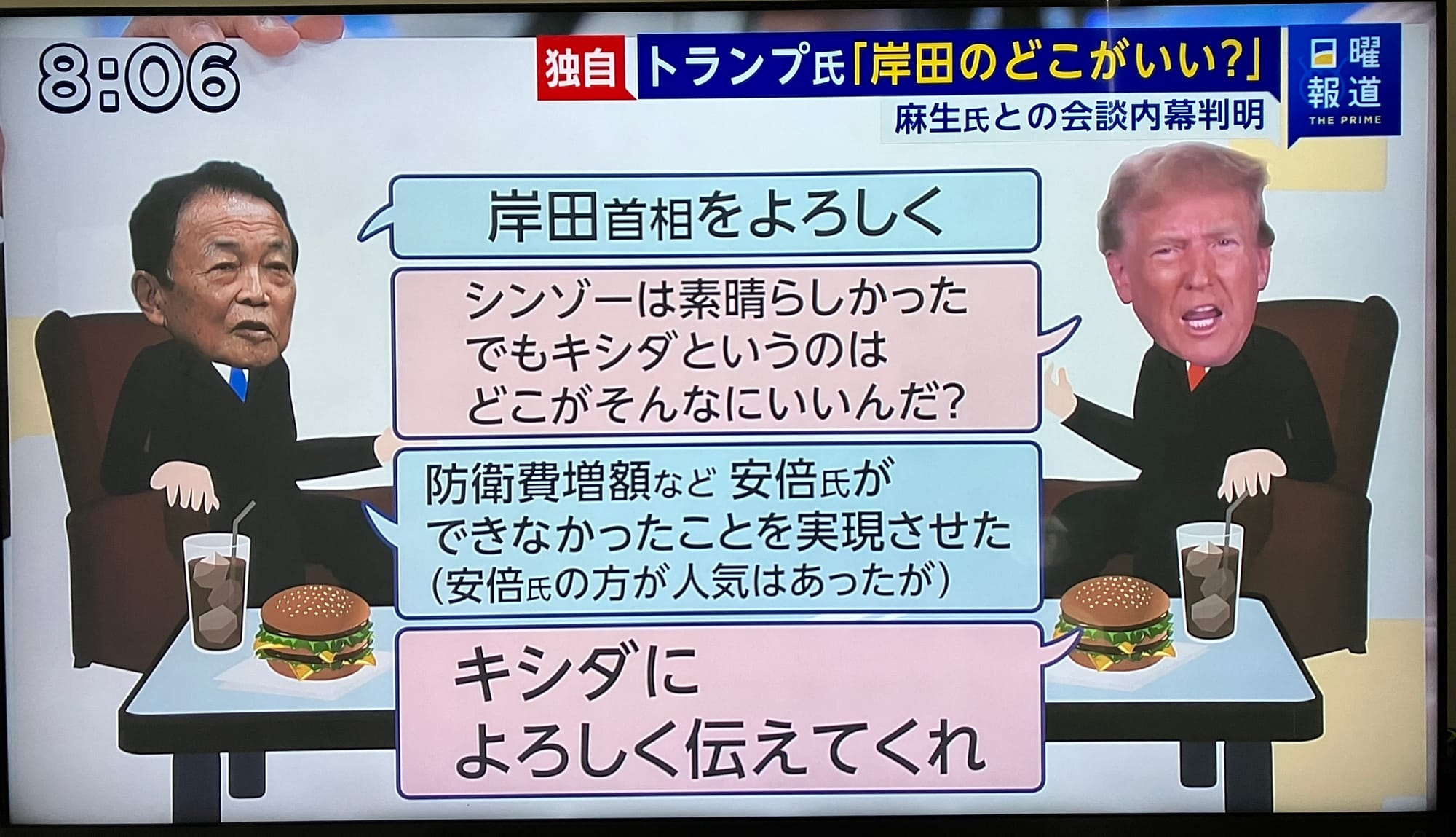 はじめに、トランプ氏からの「キシダというのはどこがそんなにいいんだ?」という発言を紹介。ただ、その後、麻生氏から「防衛費増額など安倍氏ができなかったことを実現させた」と説明があり、トランプ氏も「キシダによろしく伝えてくれ」と伝えた。