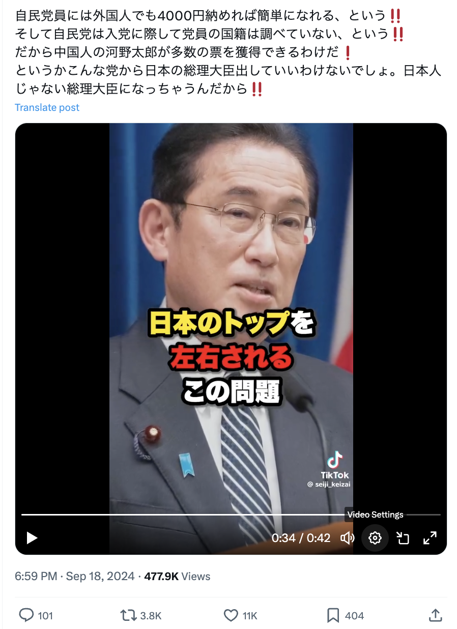 「自民党員には外国人でも4000円納めれば簡単になれる」「党員の国籍は調べていない」「実在しなくても(死者でも)投票用紙が届く」などの言説が拡散している(例1、例2)。