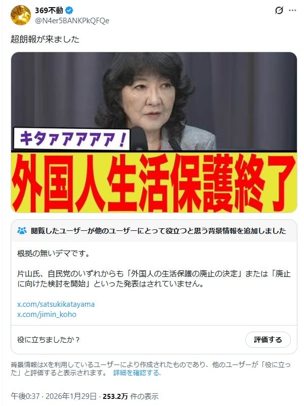 片山さつき財務相が外国人の生活保護廃止を発表したかのような投稿が拡散しましたが、誤りです。政府は2026年1月23日の閣議で、外国人の生活保護について運用を適正化する方針を決めましたが、「外国人の生活保護終了」ではありません。