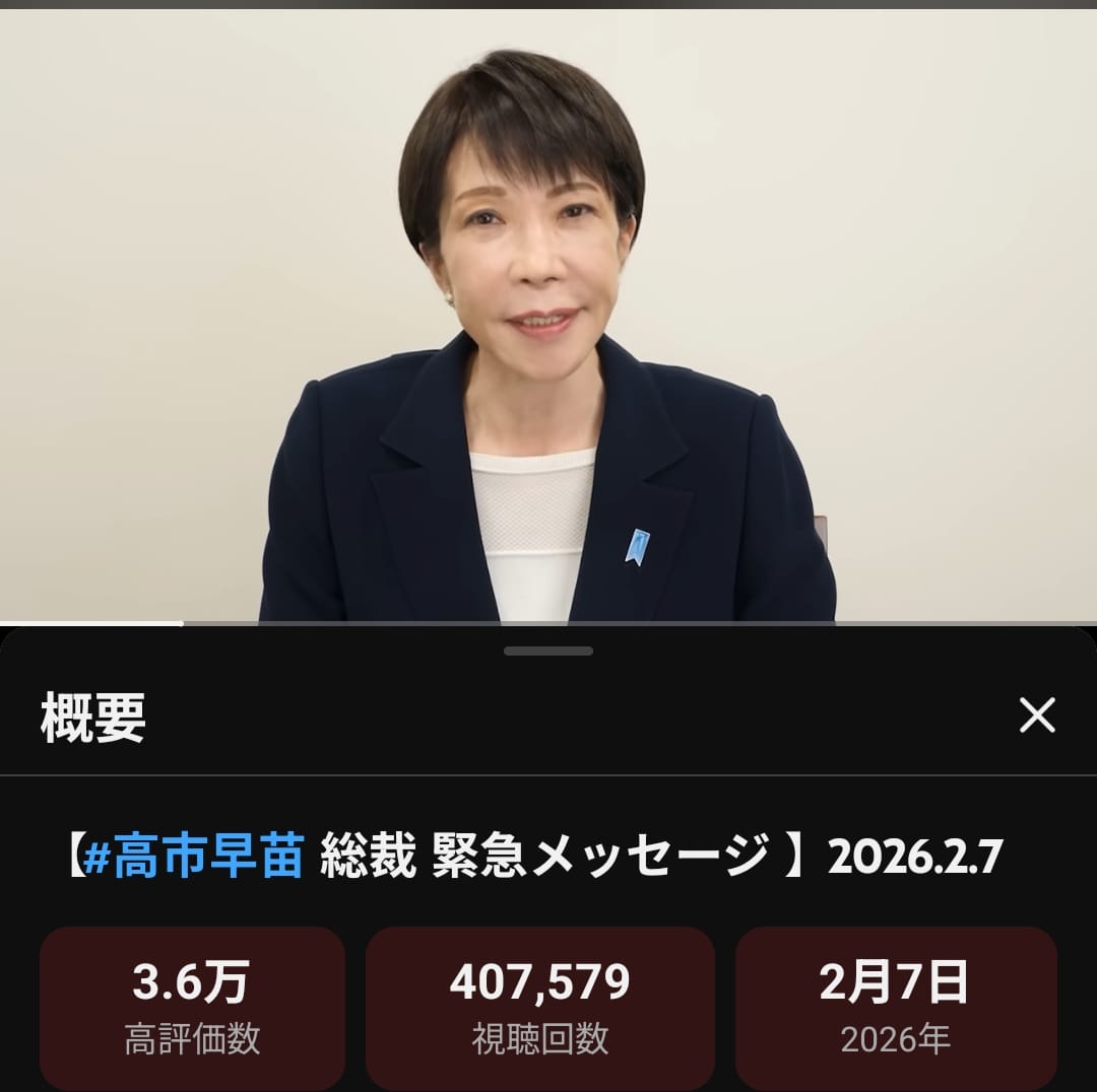 自民党YouTube公式チャンネル.”【#高市早苗 総裁 緊急メッセージ 】2026.2.7”.https://www.youtube.com/watch?v=hVbx93vJ0E8,(閲覧日2026年2月12日).