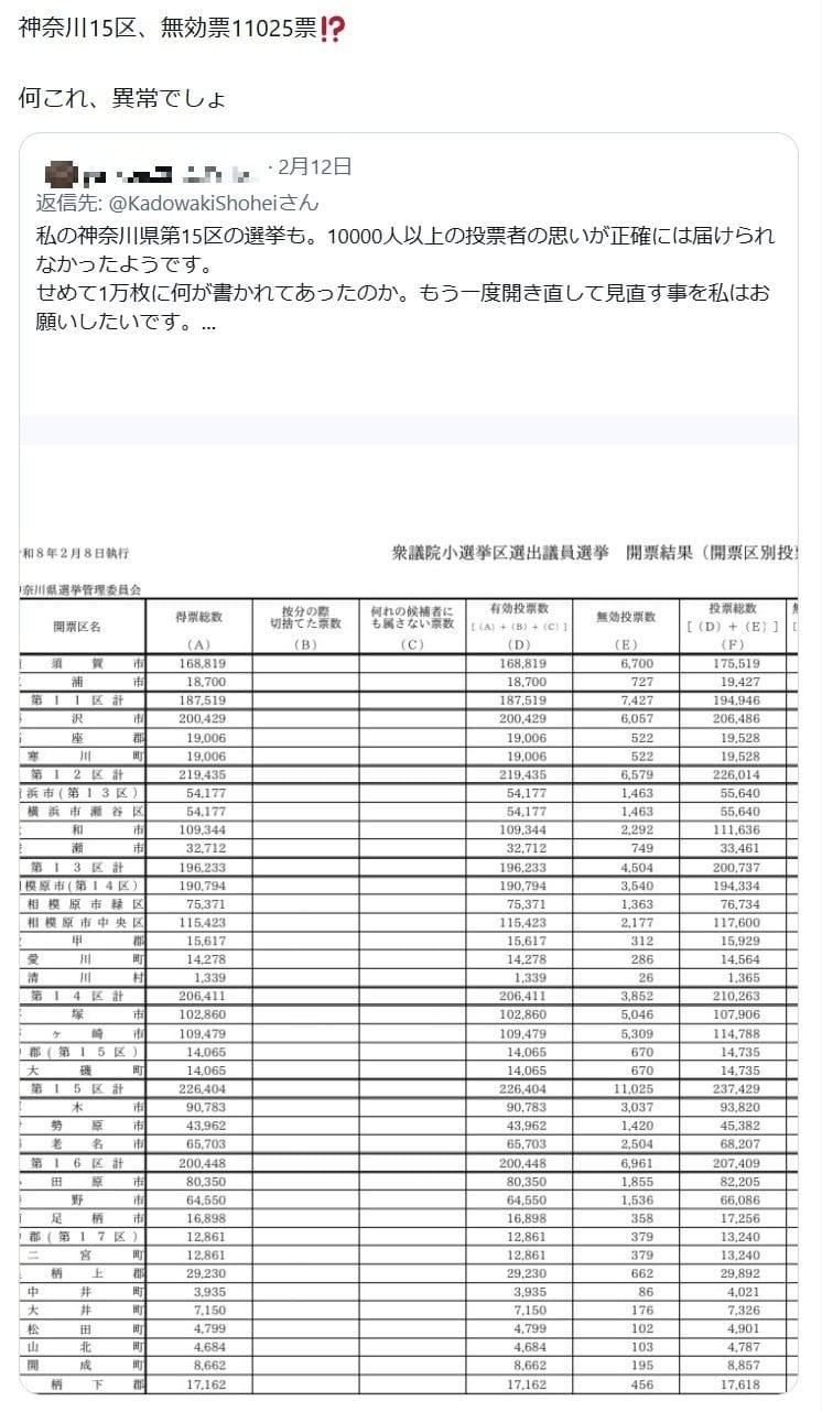 2026年2月13日、「神奈川15区、無効票11025票⁉️何これ、異常でしょ」という投稿が拡散した。投稿はXの別の投稿を引用し、「衆議院小選挙区選出議員選挙 開票結果(開票区別投票総数)」と書かれた画像が添付されている。