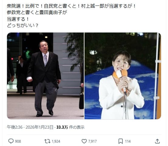 2026年1月23日、「衆院選!比例で!自民党と書くと!村上誠一郎が当選するが! 参政党と書くと豊田真由子が当選する!どっちがいい?」という投稿がXで拡散した。