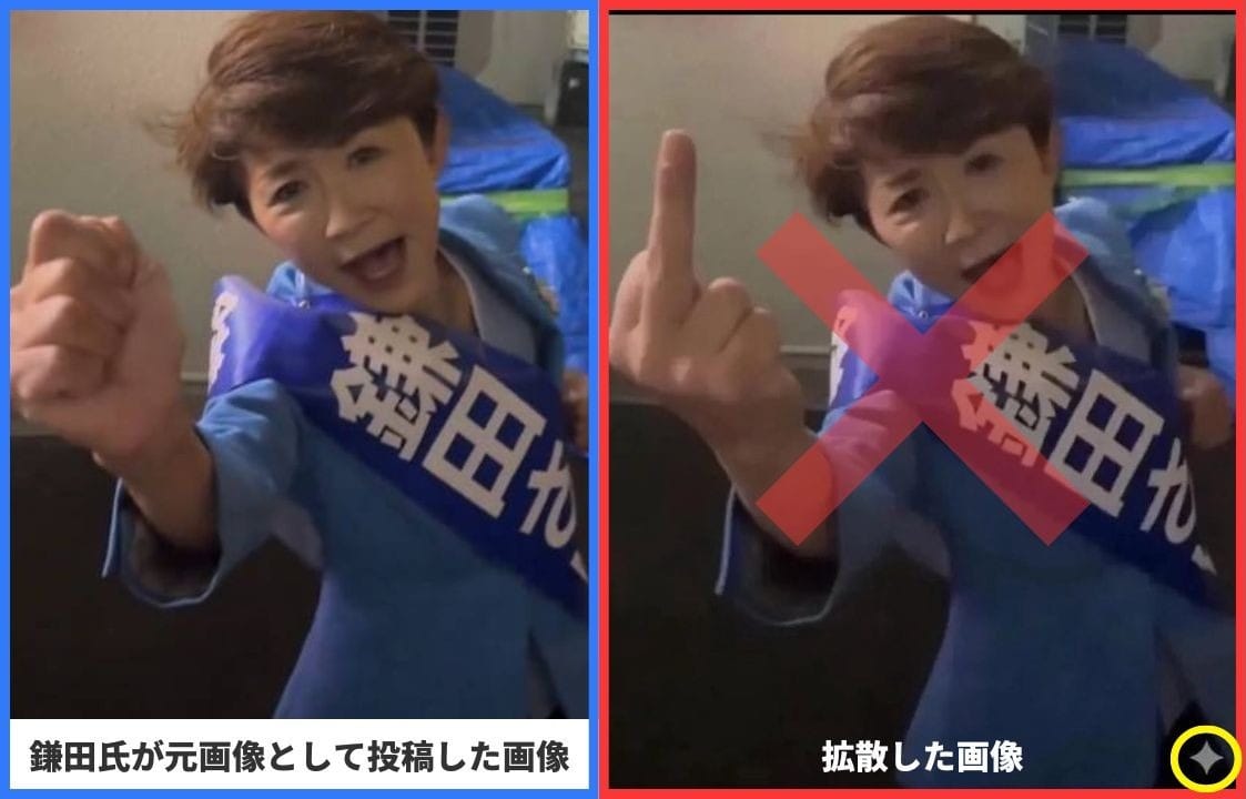 2026年2月8日投開票の衆院選で、宮城2区で中道改革連合から立候補している鎌田さゆり氏が中指を立てる画像が拡散しましたが、AIで改変されたものです。鎌田氏は、自身のXで加工される前の画像を公開しています。
