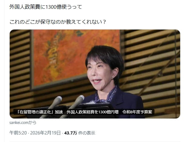 2026年2月19日、「外国人政策費に1300億使うって これのどこが保守なのか教えてくれない?」という投稿がXで拡散した。