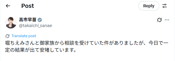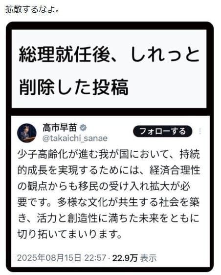 2026年2月28日、高市氏が「少子高齢化が進む我が国において、持続的成長を実現するためには、経済合理性の観点からも移民の受け入れ拡大が必要です。多様な文化が共生する社会を築き、活力と創造性に満ちた未来をともに切り拓いてまいります」という投稿を総理就任後に削除したという投稿が拡散した。