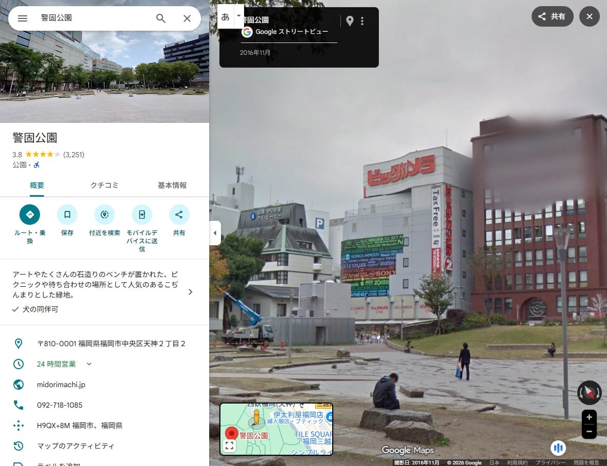 引用元の投稿には「警固公園、自民党の街頭演説前、高市さん人気凄いな…」とある。福岡県福岡市中央区天神にある警固公園の近くの「ビックカメラ 天神2号館」をGoogleマップで確認すると、ビックカメラの外観や左右の建物が画像と一致した。