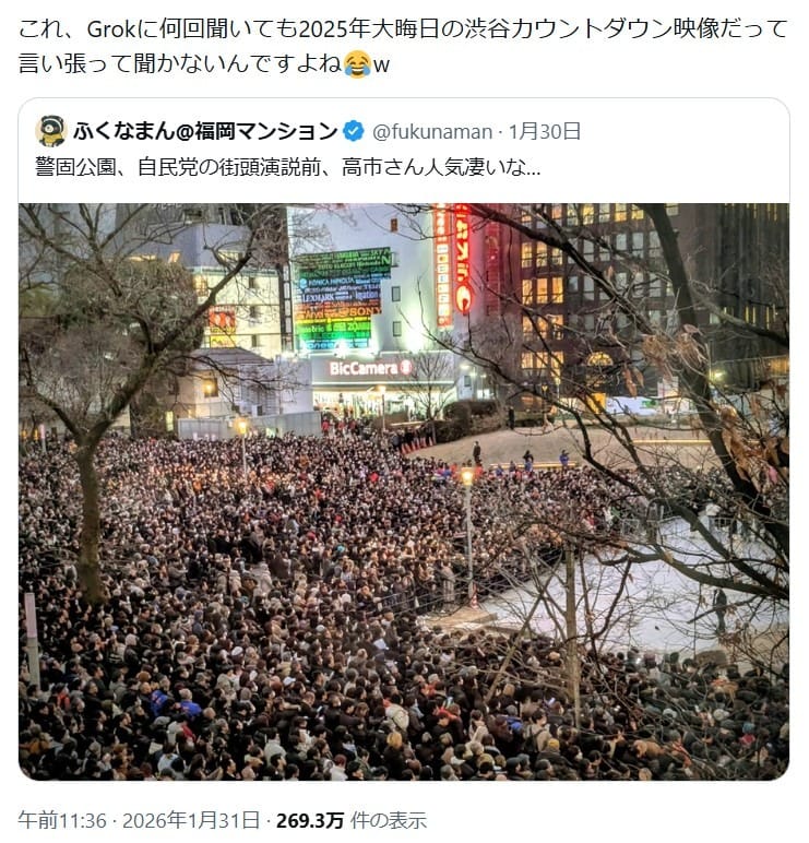 2026年1月31日、高市首相の街頭演説に集まった群衆の写真という投稿に「Grokに何回聞いても2025年大晦日の渋谷カウントダウン映像」と指摘がついた。