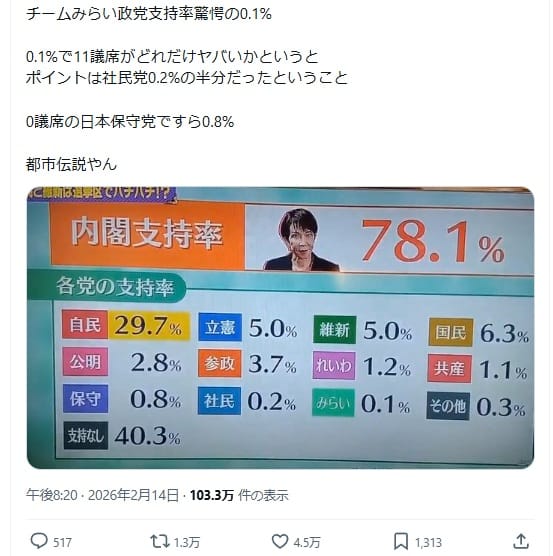 2026年2月14日、「チームみらい政党支持率驚愕の0.1%」「0.1%で11議席がどれだけヤバいかというと ポイントは社民党0.2%の半分だったということ」などの文言付きの画像がXで拡散した。