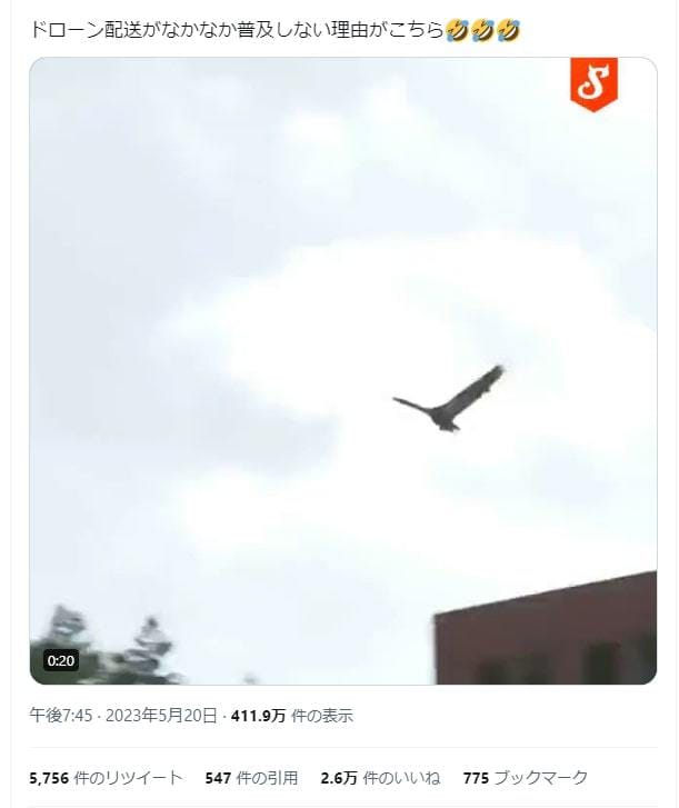 「ドローン配送がなかなか普及しない理由がこちら」との記述とともに、猛禽類が小型のドローンを捕獲する様子の動画を埋め込んだツイートが拡散した。6月7日現在、表示回数が414万回以上、リツイート件数が5700件以上となっている。