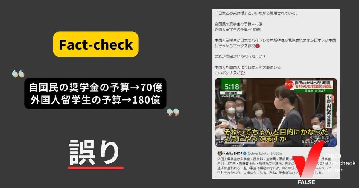 2022年以降「自国民の奨学金の予算70億円、外国人留学生の予算180億円」という言説が何度も拡散していますが誤りです。70億円は給付型奨学金制度創設時の予算であり、現在は大幅に増額されています。