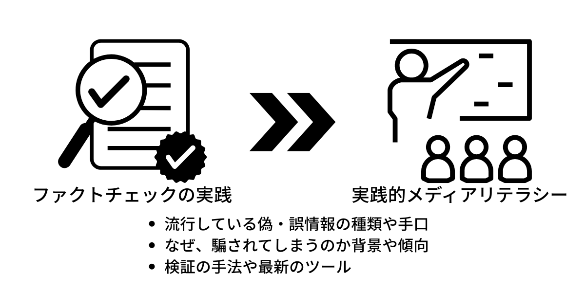 「流行している偽・誤情報の種類や手口」「なぜ、騙されてしまうのか。その背景や傾向」「検証の手法や最新のツール」などの知見を、実践的なメディア情報リテラシー教育に役立てています。