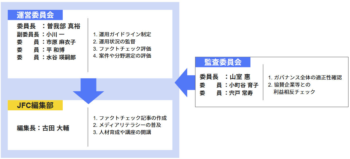 運営委員会や監査委員会のメンバーや設置規定・運営規程は公開されています(日本ファクトチェックセンター設置規定、監査委員会運営規程)。