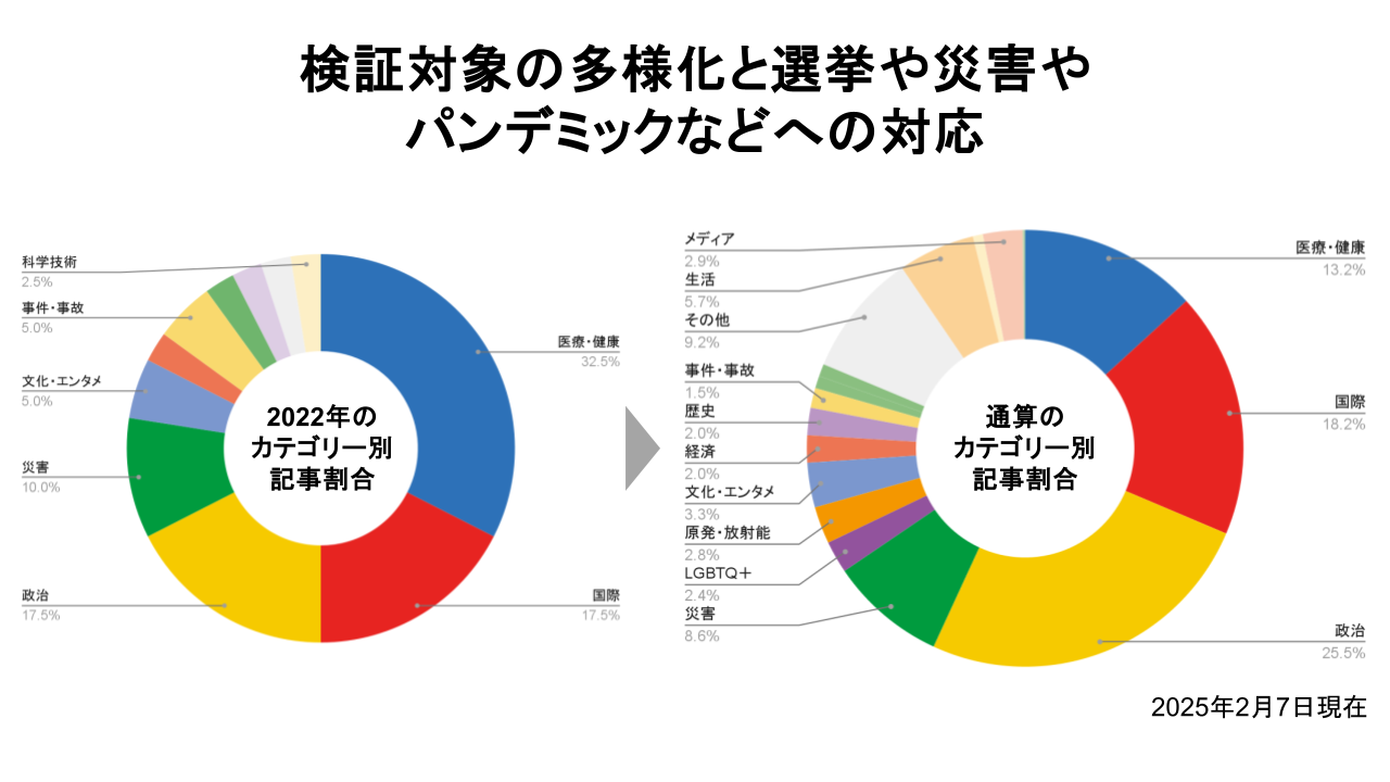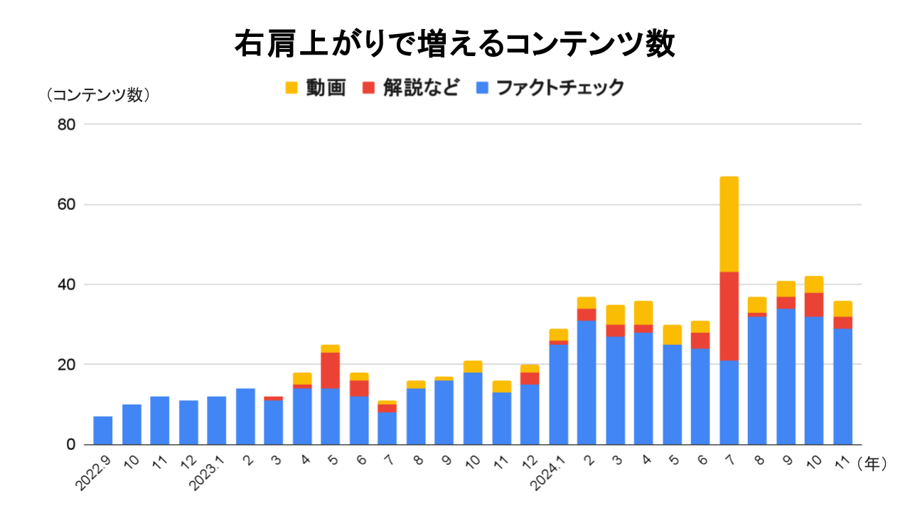 活動の中心は日々のファクトチェックとメディア情報リテラシー教育です。創設以来、検証記事や解説や動画など、コンテンツ数は順調に増えています。また、検証対象の多様化も進んでおり、2024年以降は政治系の検証が増えています。