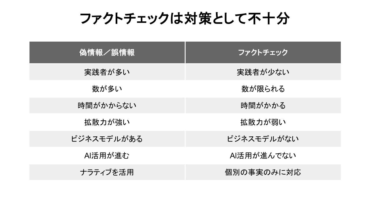 嘘は一瞬でつけますが、検証には時間がかかります。しかも、大量に拡散する偽・誤情報に対して、ファクトチェックを実施する組織や個人は限られています。