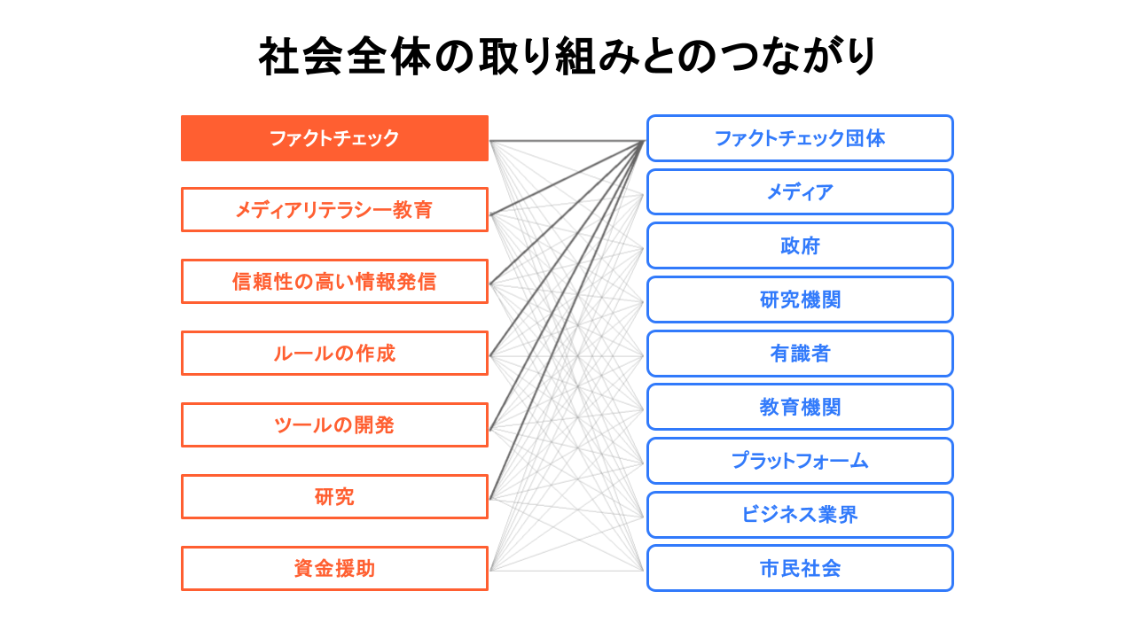 求められているのは、社会全体での取り組みです。ファクトチェックは対策の重要な柱で、実践的なメディア情報リテラシー教育や調査研究やツール開発の起点ともなり得ますが、対策の一部として考える必要があります。