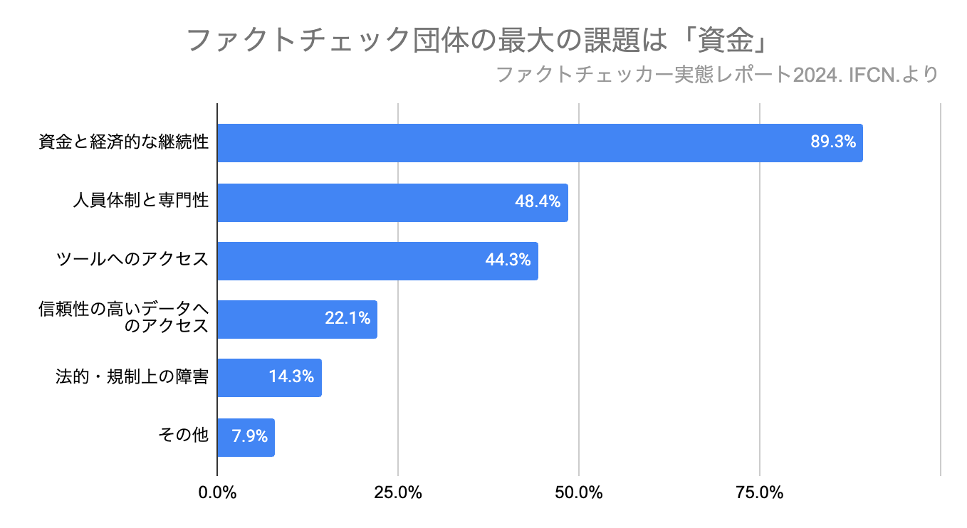国際ファクトチェックネットワーク(IFCN)の「ファクトチェッカー実態レポート」2024年版によると、世界141団体の89.3%が経済的な継続性に不安を抱えています。