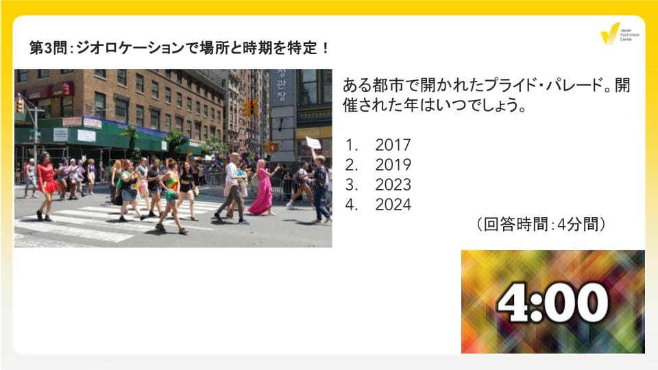 11月30日に本選を実施。参加者はプレイベントで学んだ技術を使って、ネット上の資料を探したり、架空の記事の間違いを見つけたり、ジオロケーションや生成AIによる画像加工の特定など、5つの問題に挑みました。