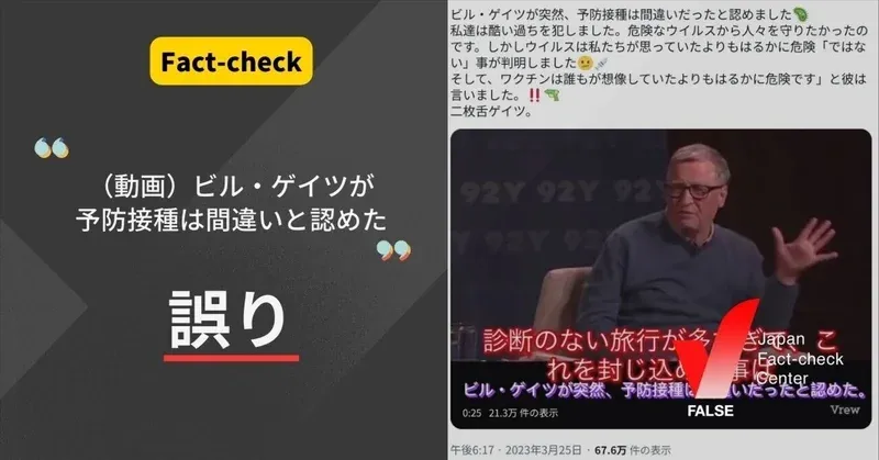 マイクロソフト創設者のビル・ゲイツ氏が「予防接種は間違いと認めた」という投稿が日本語字幕付きの動画とともに拡散しました。