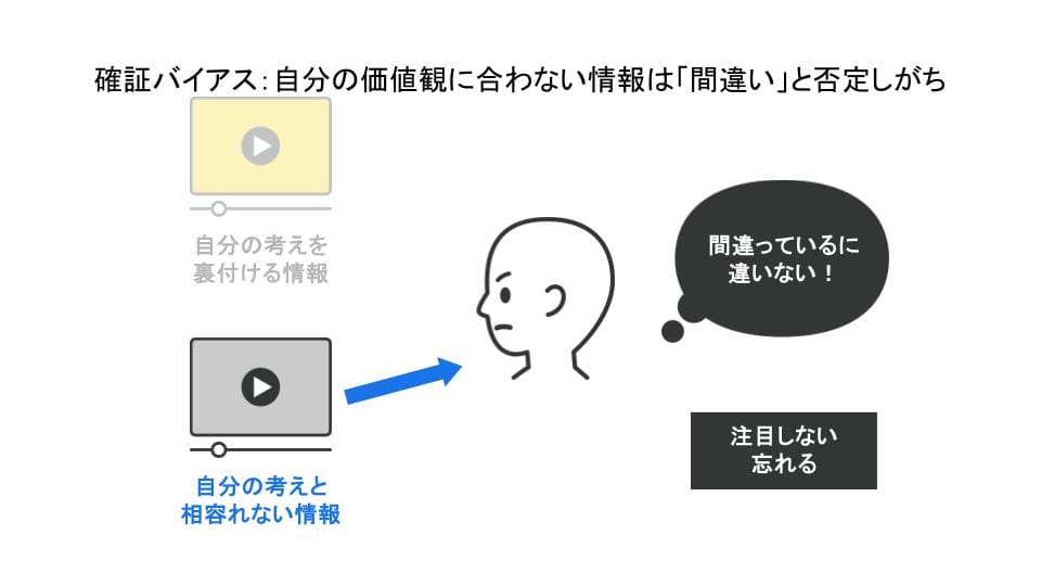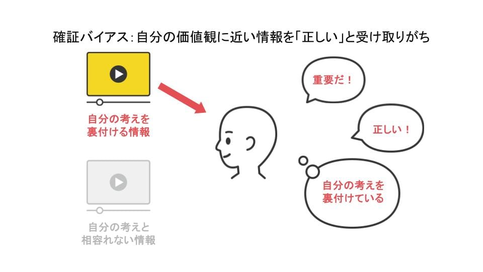 例えば、自分の考えを裏付ける情報に対して、人は「重要だ」「正しい」と思いがちです。根拠の書かれていない情報でも「自分の考えに近い」というだけですぐにシェアをしてしまうのは、そういう理由もあります。
